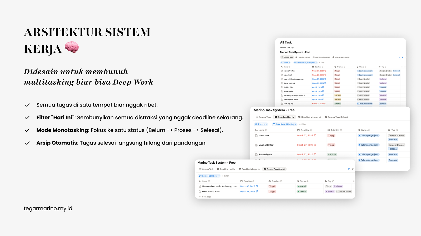 That’s why I built the Marino Task System. This isn't just another Notion template; it's a Focus Architecture designed with Minimalism and Kaizen principles.