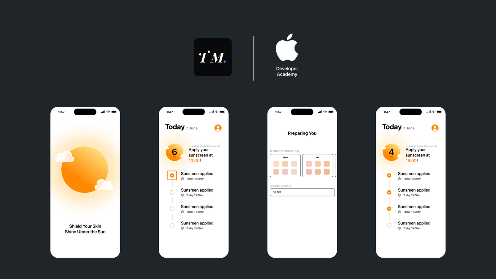 Technical Execution & Development On the development side, I architected the Sun Shield system using SwiftUI, focusing on high performance and data accuracy. I implemented Geo-Location integration to fetch specific UV index data based on the user's precise coordinates. Additionally, I built the on-device logic to automatically calculate skin protection duration, which triggers a smart Notification system for sunscreen reapplication reminders. This project combines intuitive Game Design with location-aware technology to create a proactive user experience in preventing skin damage and skin cancer risks.