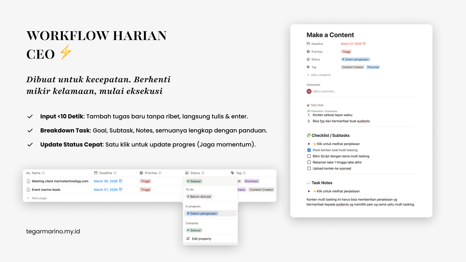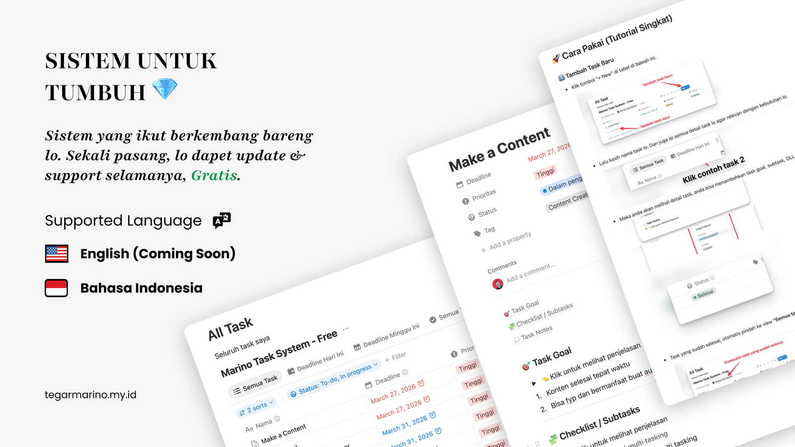 That’s why I built the Marino Task System. This isn't just another Notion template; it's a Focus Architecture designed with Minimalism and Kaizen principles.